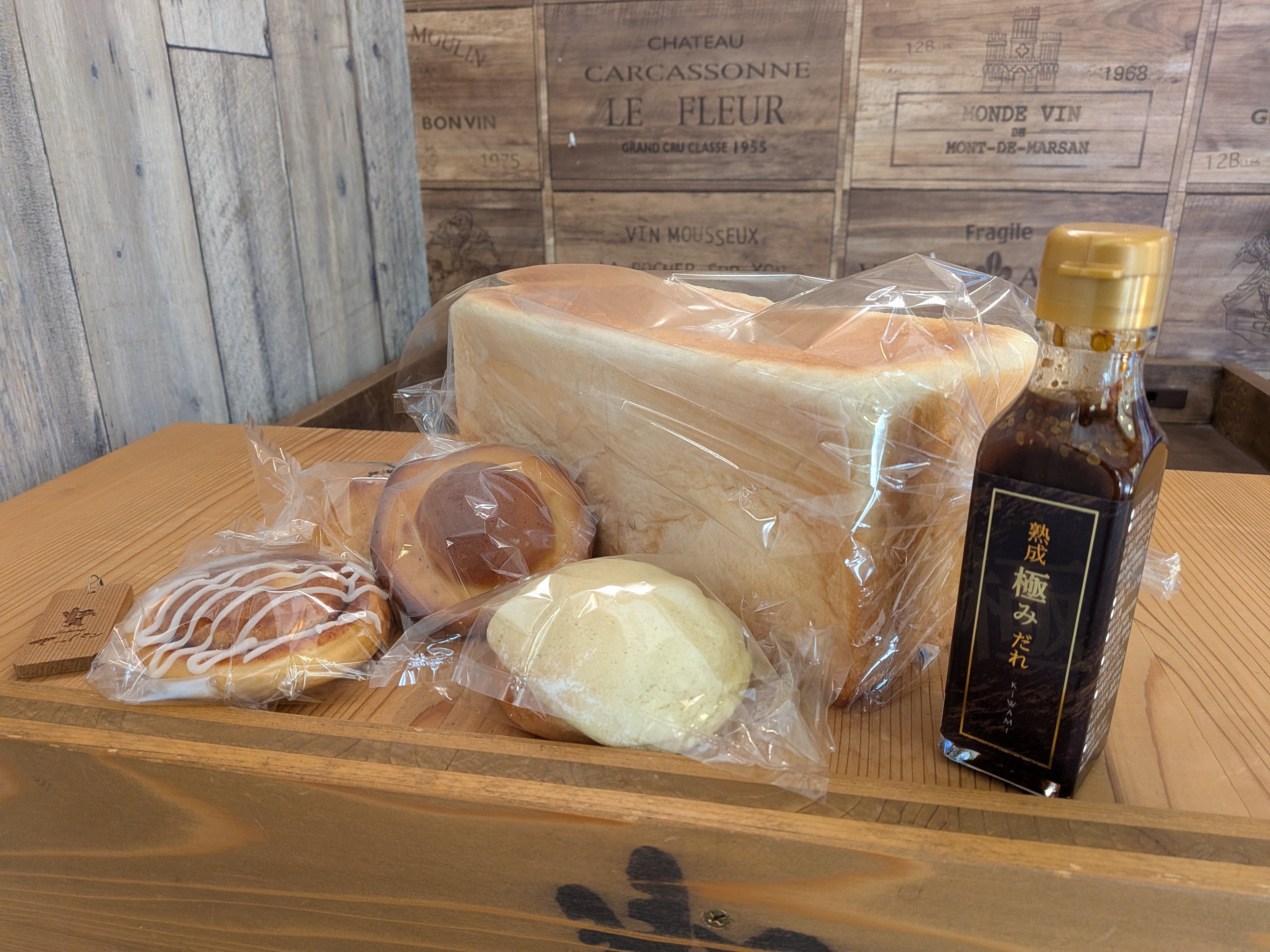 シナモンロール、てっパン帽子、餡パン、メロンパン、生食パン、バゲット、焼肉のタレなどの詰め合わせになります。